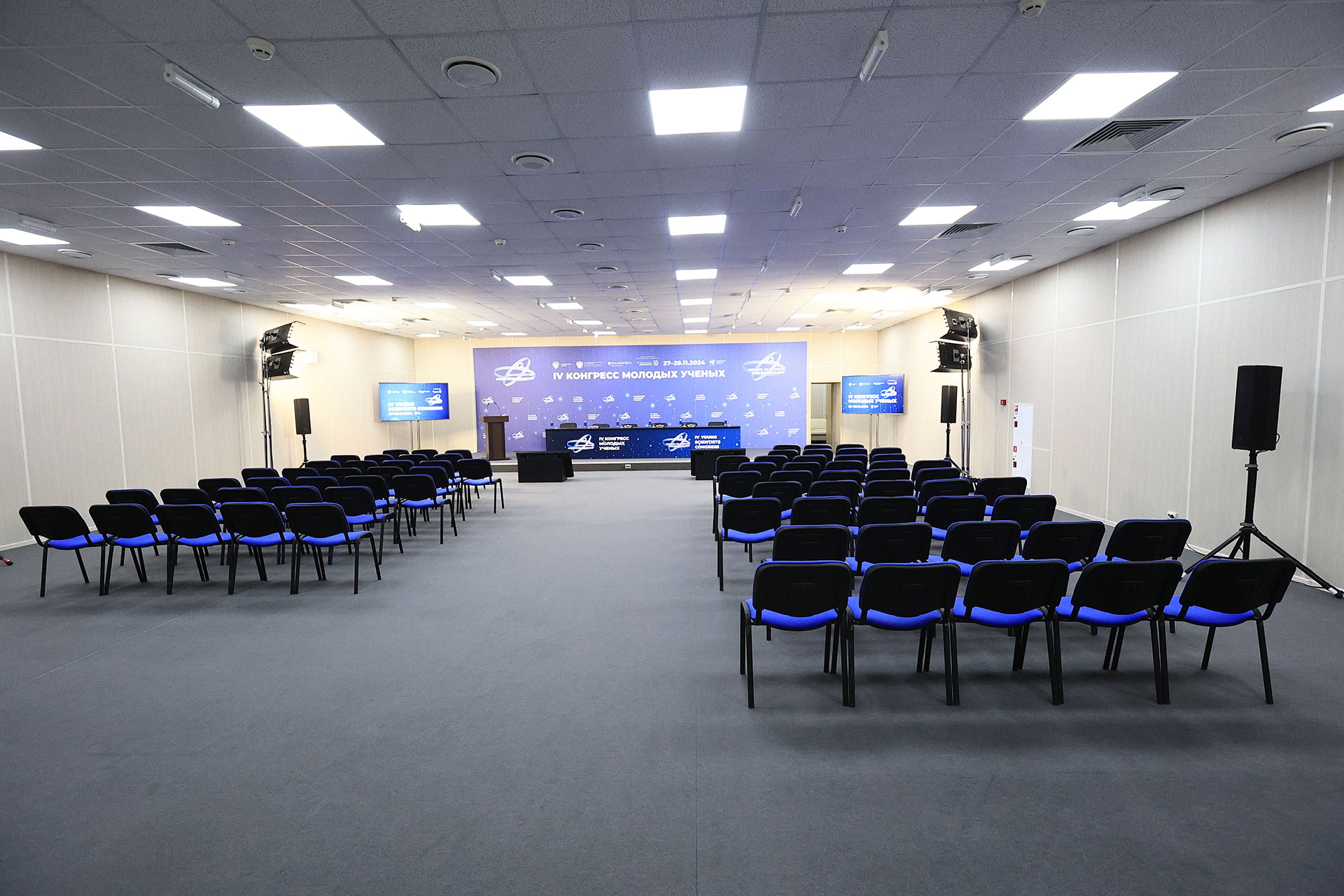 Оборудование: конференц-система, радиомикрофоны, 2 плазменные панели, ноутбук для презентаций, телесуфлер для президиума, трибуна докладчика, система аудиопротоколирования, осветительное оборудование, комната для докладчиков